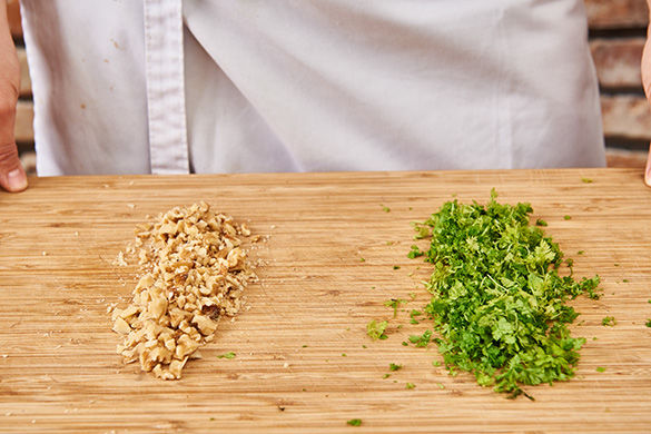 Die Petersilie samt Stängeln grob hacken. Die Walnüsse fein hacken und mit ca. 3/4 der Petersilie zu den Pilzen in die Pfanne geben. Mit Salz und Pfeffer abschmecken.