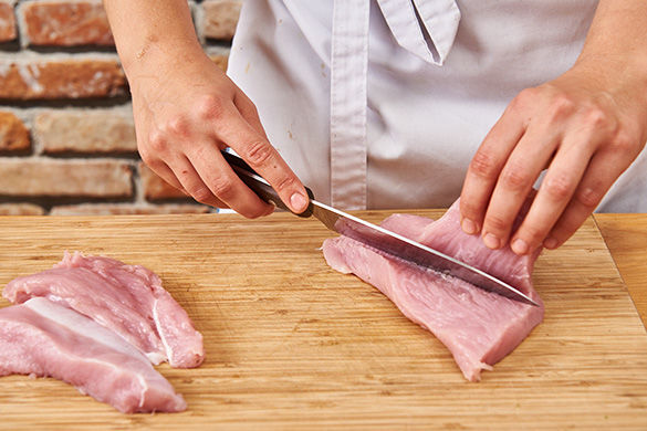 Die Hähnchenbrust längs halbieren, sodass jeweils zwei 2–3cm dicke Filets entstehen. In einer zweiten großen Pfanne 1–2EL Olivenöl erhitzen und das Fleisch von beiden Seiten bei starker Hitze ca. 1–2Min. scharf anbraten. Aus der Pfanne nehmen und mit Salz und Pfeffer würzen.