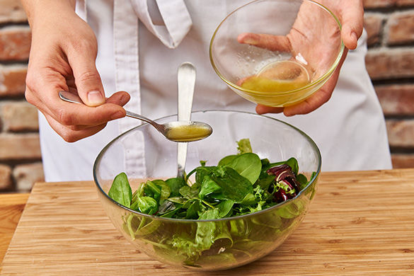 Aus 2EL Olivenöl, 1EL Essig, Salz und Pfeffer ein Dressing anrühren und mit dem Salat vermischen. Die Hähnchen-Blätterteig-Taschen mit der restlichen Petersilie garnieren und mit dem Salat servieren.