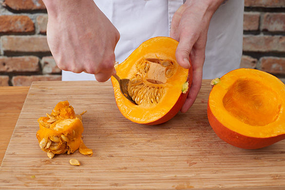 Den Umluftofen auf 250°C vorheizen und ein Backblech mit Backpapier auslegen. Den Kürbis halbieren und mit einem Löffel die Kerne herausnehmen. Die Kürbishälften mit der Schnittseite nach unten auf das Blech legen und im vorgeheizten Ofen ca. 20-25Min. backen.