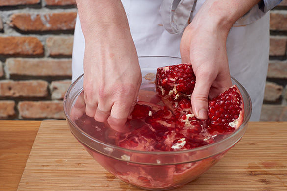 Wasser in eine große Schüssel füllen. Den Deckel vom Granatapfel abschneiden und seitlich entlang der weißen Haut einschneiden. Nun fächerartig auftrennen und unter Wasser die Kerne heraustrennen. Die weiße Haut des Granatapfels von der Wasseroberfläche abschöpfen und die Kerne in ein Sieb abgießen.