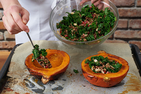 Weihnachten lässt sich auch vegetarisch genießen: Mit einer Mischung aus braunen Linsen, Grünkohl und Mandeln gefüllt, bieten Hokkaido-Kürbisse ein wunderbar nussiges Pendant zu der traditonellen Weihnachtsgans. Trakaja Käse und süßer Granatapfel kommen als i-Tüpfelchen oben drauf.