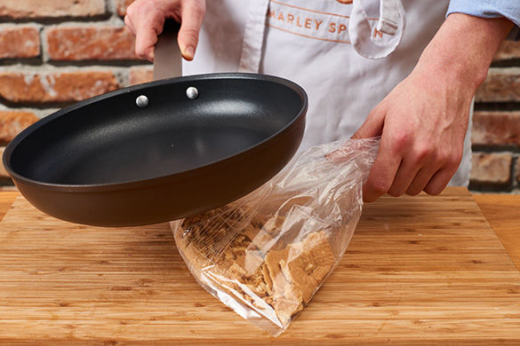 Die Kekse in der Verpackung lassen oder in eine Plastiktüte geben und mit der Rückseite einer Pfanne zerstoßen. Es sollten Semmelbrösel-ähnliche Krümel entstehen, ein paar größere Klumpen sind aber nicht schlimm. In einer kleinen Pfanne nun die Butter bei niedriger Hitze schmelzen, dann mit den Keksen vermischen und auf Gläser verteilen.