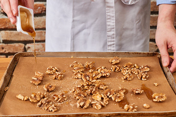 Die Walnüsse auf ein mit Backpapier belegtes Blech legen und leicht salzen. Den Honig darüber träufeln, ggf. vorher in einem Warmwasserbad flüssig werden lassen. Nüsse im Ofen ca. 8-12Min. backen. Etwas abkühlen lassen.