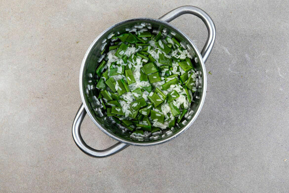 Die Enden der Bohnen abschneiden und die Bohnen in mundgerechte Stücke schneiden. Die Bohnen nach 4–5Min. zum Reis geben, gut unterrühren und mitgaren. Nach Ende der Garzeit noch ca. 5Min. ohne Hitzezufuhr ziehen lassen.