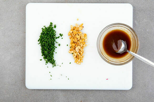 Den Schnittknoblauch in feine Röllchen schneiden. Die Erdnüsse grob hacken. Die Hoisinsauce mit 2–3EL Wasser verrühren.