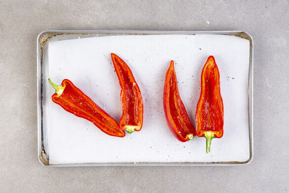 Den Backofen auf 240°C (220°C Umluft) vorheizen. In einem mittelgroßen Topf 600ml leicht gesalzenes Wasser zum Kochen bringen. Die Paprika längs halbieren, die Kerne entfernen und auf ein mit Backpapier ausgelegtes Backblech geben. Mit 1 Prise Salz würzen, mit 1TL Olivenöl beträufeln und ca. 10Min. im Ofen vorbacken.