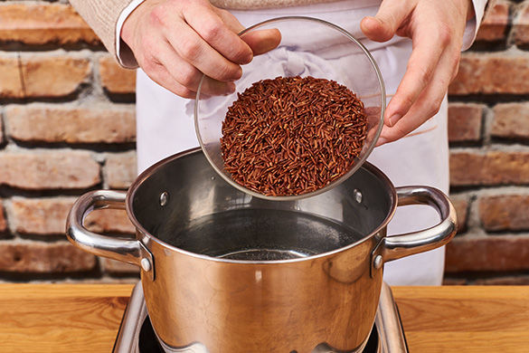Den Ofen auf 200°C Umluft vorheizen. Einen mittleren Topf mit ca. 1L Wasser zum Kochen bringen. 3/4 vom Reis in einem Sieb unter fließendem Wasser abspülen, bis das Wasser klar bleibt. Sobald das Wasser kocht, den Reis mit etwas Salz ca. 30-35Min. köcheln lassen, bis der Reis gar ist.