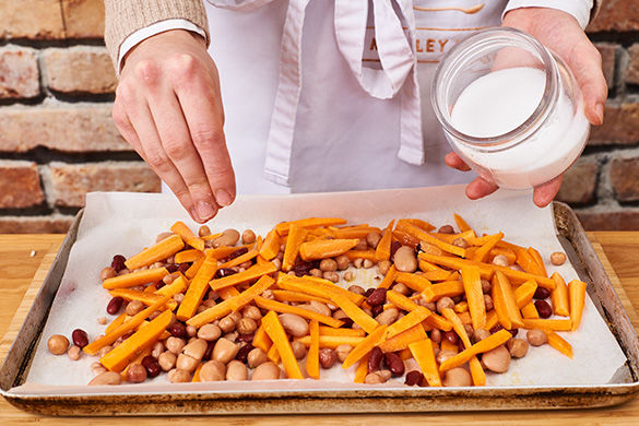 Die Karotten und die Bohnen auf einem mit Backpapier belegten Backblech verteilen, mit 1EL Olivenöl und Salz vermischen und im Ofen ca. 15–20Min. rösten, bis die Karotten gar sind.
