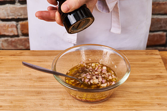 Inzwischen die Schalotte schälen, möglichst fein hacken und mit dem Himbeeressig, 1–2EL Olivenöl sowie Salz und Pfeffer verrühren.