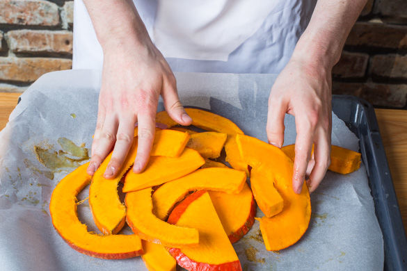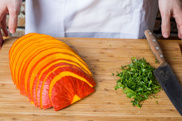Backofen auf 200°C Umluft vorheizen. Den Kürbis vom Strunk befreien, halbieren und die Kerne herauslösen. In ca. 1cm dicke Scheiben schneiden. Petersilie grob schneiden. Einen mittleren Topf mit 800ml leicht gesalzenem Wasser zum Kochen bringen.