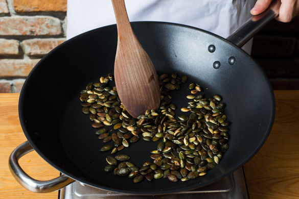 Den Quinoa unter warmen Wasser abspülen und anschließend im kochenden Wasser ca. 10Min. kochen und dann weitere ca. 5Min. bedeckt bei niedriger Hitze quellen lassen. Inzwischen in einer mittleren Pfanne die Kürbiskerne ohne Öl bei mittlerer Hitze ca. 2-3Min. rösten, bis sie anfangen in der Pfanne zu springen.
