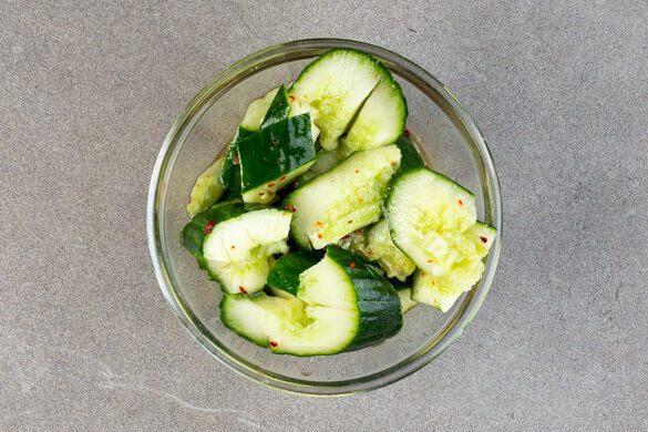 Das Sesamöl mit 1TL Chiliflocken oder mehr nach gewünschtem Schärfegrad, 75ml hellem Essig, 2EL Zucker und 1/2TL Salz verrühren. Das Dressing mit den Gurken vermengen.