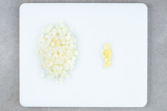 Den Backofen auf 220°C (200°C Umluft) vorheizen. Die Zwiebeln schälen, halbieren und in feine Würfel schneiden. Den Knoblauch schälen und ebenfalls fein würfeln.