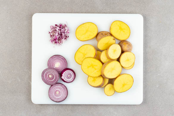 Den Backofen auf 220°C (200°C Umluft) vorheizen. Die Kartoffeln samt Schale in ca. 1cm breite Scheiben schneiden. Die Zwiebeln schälen und in ca. 1cm dicke Ringe schneiden. Ca. 1/4 der Zwiebelringe fein würfeln.