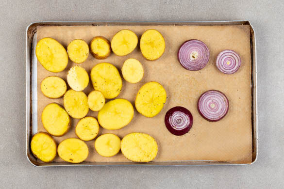 Die Kartoffeln und die Zwiebelringe auf zwei mit Backpapier ausgelegten Backblechen mit jeweils 1EL Olivenöl und je 1/2TL Salz und Pfeffer vermengen, gleichmäßig verteilen und 15–20Min. im Ofen rösten, bis die Kartoffeln knusprig und gar sind. Je nach Ofen die Position der Bleche nach der Hälfte der Zeit tauschen.