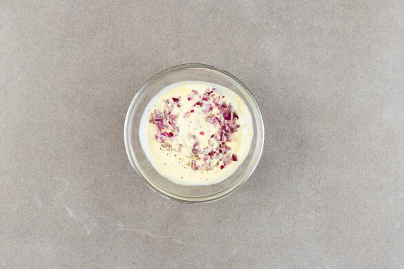 Den Joghurt mit 1EL Mayonnaise und 1TL Senf verrühren, dann die Zwiebelwürfel unterrühren und den Dip mit Salz und Pfeffer abschmecken.