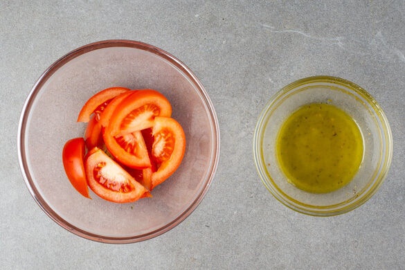Die Tomaten in dünne Spalten schneiden. 4EL Olivenöl, 2EL Essig und 1/2–1TL Salz verrühren und das Dressing mit Pfeffer abschmecken.