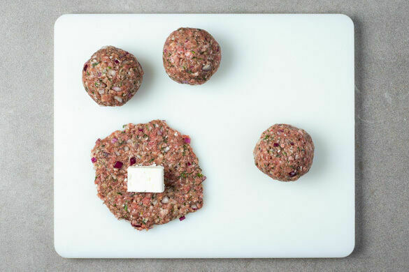 Den Feta jeweils in 4 gleich große Stücke schneiden. Das Hackfleisch mit den Zwiebelwürfeln, dem Knoblauch, der 1/2 des Dills und je 1/2TL Salz und Pfeffer gut verkneten, in 8 gleich große Portionen teilen und zu ca. 1cm dicken Frikadellen formen. Jede Frikadelle mit 1 Stück Feta füllen und die Fleischränder sorgfältig darüber verschließen.