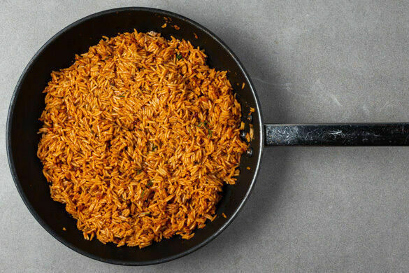 Den Reis, das Pesto, die Gewürzmischung und 600ml warmes Wasser in die Pfanne geben. Aufkochen und abgedeckt bei niedriger Hitze ca. 10Min. köcheln lassen, bis der Reis fast gar ist.
