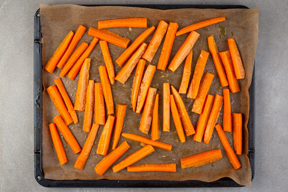Den Backofen auf 240°C (220ºC Umluft) vorheizen. Die Karotten ggf. schälen, quer halbieren und in pommesartige, ca. 1cm dicke Stifte schneiden. Auf einem mit Backpapier ausgelegten Backblech mit 1EL Pflanzenöl und 1EL Ahornsirup sowie je 1 Prise Salz und Pfeffer vermengen, gleichmäßig verteilen und 16–18Min. im Ofen rösten.
