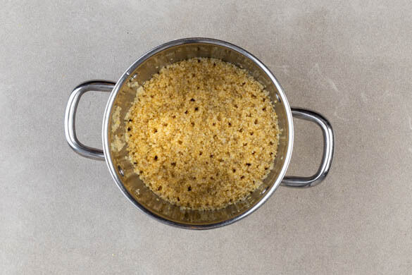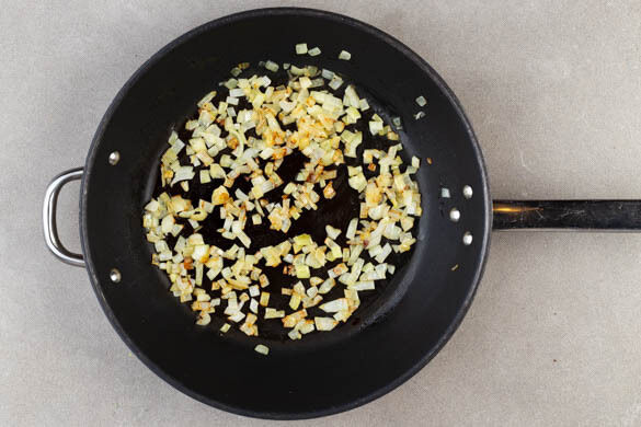 Den Knoblauch schälen und sehr fein würfeln oder durch eine Knoblauchpresse drücken. Die Zwiebeln schälen und halbieren, dann fein würfeln und in der Pfanne mit 2EL Pflanzenöl bei mittlerer Hitze 3–4Min. glasig anbraten.