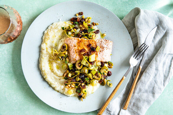 Saftiges Lachsfilet mit Selleriepüree und Oliven-Rosinen-Topping mit Pinienkernen