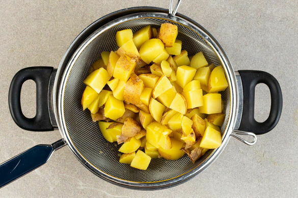 In einem großen Topf ausreichend gesalzenes Wasser für die Kartoffeln zum Kochen bringen. Die Kartoffeln samt Schale in ca. 1cm große Würfel schneiden, dann in das kochende Wasser geben und bei starker Hitze in 10–12Min. bissfest kochen. In ein Sieb abgießen und abtropfen lassen.