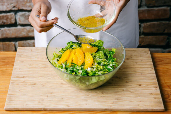 Den Salat in Streifen schneiden, dabei den Strunk entfernen. Aus 1EL Olivenöl, dem restlichen Zitronensaft, 2EL Wasser, der 1/2 der Orangenschale sowie je 1 Prise Salz und Pfeffer ein Dressing anrühren und mit den Orangenspalten unter den Salat mengen.