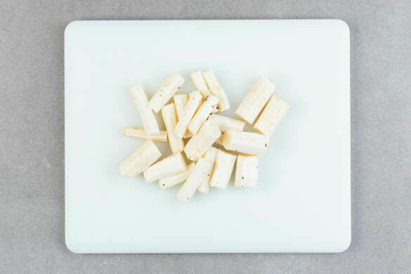 Die Zitronenschalen abreiben, dann die Zitronen halbieren und auspressen. Eine Schüssel ca. 20cm hoch mit Wasser füllen und die 1/2 des Zitronensafts mit den ausgepressten Zitronenhälften hineingeben. Die Schwarzwurzeln abspülen, schälen, quer halbieren und sofort in das Zitronenwasser legen. Anschließend trocken tupfen und in ca. 4cm große Stücke schneiden.
