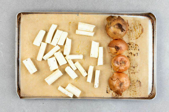Die Schwarzwurzeln mit 1EL Olivenöl vermengen und nach ca. 10Min. Backzeit zu den Zwiebeln auf das Backblech geben. Das gesamte Gemüse im Ofen in 15–20Min. goldbraun und gar backen.