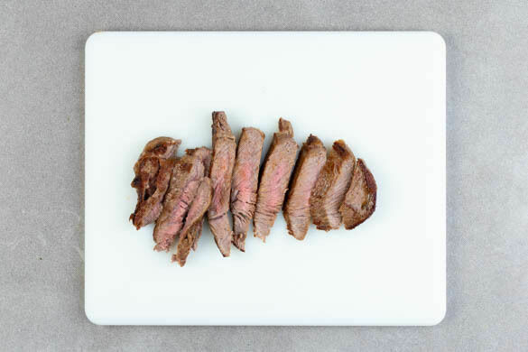 Das Fleisch trocken tupfen, mit Salz und Pfeffer würzen und in einer großen Pfanne mit 2EL Olivenöl bei starker Hitze auf der Fettseite 2–4Min. scharf anbraten. Wenden und weitere 2–4Min. braten, je nach Dicke des Fleisches. Die Hitze reduzieren und das Fleisch 1–3Min. abgedeckt garen, je nachdem, ob es medium oder durch sein soll. Abgedeckt auf einem Teller ruhen lassen.