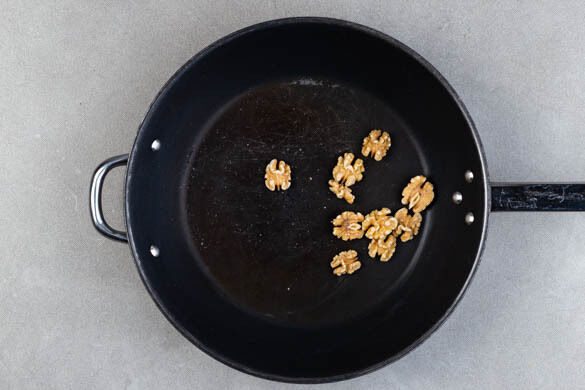 Die Walnüsse in einer mittelgroßen Pfanne ohne Zugabe von Fett bei mittlerer Hitze 1–2Min. anrösten. Vorsicht, sie können schnell zu dunkel werden. Zum Abkühlen aus der Pfanne nehmen und beiseitestellen.