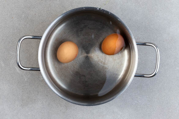 Die Eier vorsichtig in das kochende Wasser geben und in ca. 6Min. weich kochen. Tipp: Wer härtere Eier mag, kocht sie 2Min. länger. Die Eier in ein Sieb abgießen, kalt abschrecken und schälen.