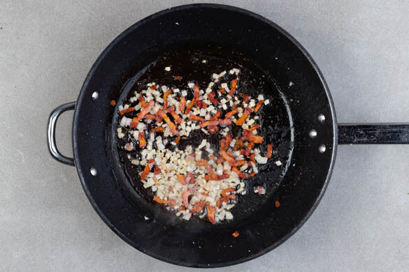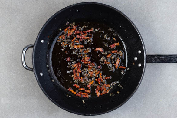 Die Baconstreifen in der Pfanne mit 1EL Pflanzenöl bei starker Hitze in ca. 7Min. knusprig braten. Inzwischen die Schalotte schälen, halbieren und fein würfeln. Die Schalottenwürfel in die Pfanne geben und 1–2Min. mitbraten.