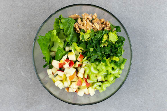Die 1/2 der Endivie in mundgerechte Stücke schneiden, die restliche Endivie wird für dieses Rezept nicht benötigt. Den Apfel vierteln, entkernen und in ca. 1cm große Stücke schneiden. Den Sellerie in dünne Scheiben, die Sellerieblätter und die Petersilie samt Stängeln grob schneiden und mit der Endivie, den Äpfeln, dem Sellerie und den Walnüssen vermengen.