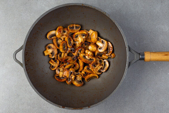 Den Knoblauch, 1EL Sojasauce und die Sriracha-Sauce in derselben Pfanne mit 1TL Pflanzenöl bei mittlerer bis starker Hitze einige Sekunden erwärmen, dann die Pilze dazugeben und 4–5Min. braten. Die Pilze aus der Pfanne nehmen, sobald sie appetitlich gebräunt und weich sind.