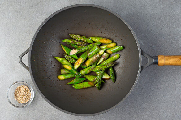 Den Sesam in einer großen Pfanne oder einem Wok ohne Zugabe von Fett bei mittlerer Hitze 30Sek.–1Min. goldbraun anrösten. Vorsicht, er wird schnell dunkel! Aus der Pfanne nehmen und beiseitestellen. Den Spargel in der Pfanne mit 1EL Pflanzenöl bei starker Hitze unter Rühren ca. 3Min. braten, mit 1TL Sojasauce ablöschen, ca. 1Min. weiterbraten, herausnehmen und beiseitestellen.
