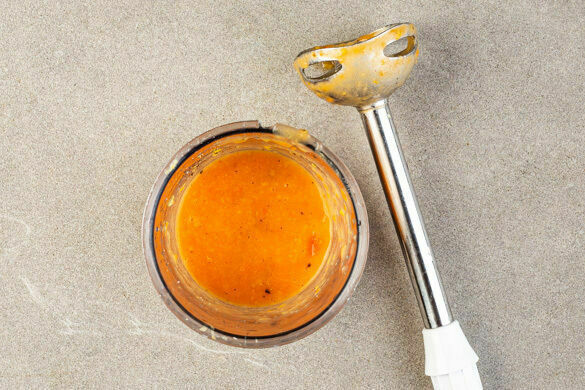 Die gebackenen Tomaten, den Knoblauch, 1TL Zitronenschale, den restlichen Zitronensaft sowie je 1 Prise Salz und Pfeffer in einem hohen Gefäß mit einem Stabmixer zu einer glatten Sauce pürieren.