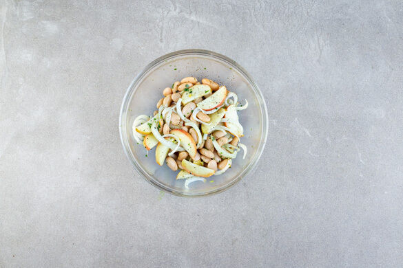 Die Bohnen in einem Sieb mit kaltem Wasser abspülen, abtropfen lassen und mit der 1/2 des Dressings vermengen. Den gerösteten Fenchel und die Apfelscheiben unterheben und ggf. mit Salz und Pfeffer abschmecken.