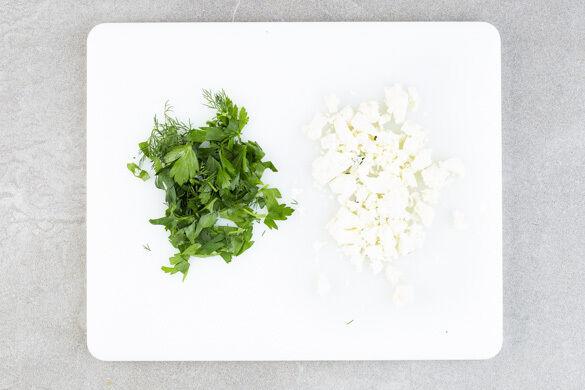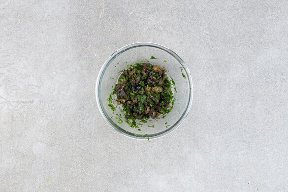 Die Oliven grob schneiden. Den Dill und die Petersilie samt Stängeln fein schneiden, dann die 1/2 der Kräuter mit den Oliven, 1–2EL Zitronensaft, 2EL Wasser und 1 Prise Salz zu einem Dressing vermengen.