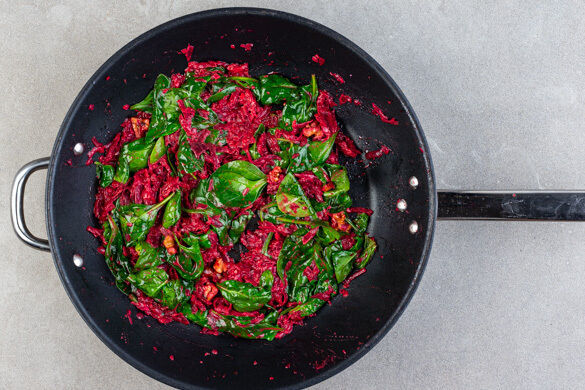 Die Rote Bete und den Knoblauch in der Pfanne mit 2EL Olivenöl bei mittlerer Hitze 2–3Min. braten. Mit 2EL Balsamicoessig ablöschen und mit Salz und Pfeffer abschmecken.
