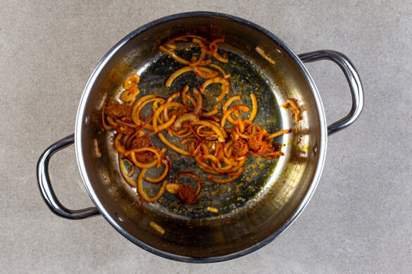 Die Zwiebeln in einem großen Topf mit 2EL Pflanzenöl und der Currypaste bei mittlerer Hitze 1–2Min. anbraten.