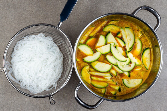 Die Zwiebeln mit 1,5L heißem Wasser und der Kokosmilch ablöschen, das Brühgewürz unterrühren. Dann den Sellerie und das Fleisch in die Suppe geben und 1–2Min. garen. Die Suppe mit Salz abschmecken. In einem mittelgroßen Topf ausreichend gesalzenes Wasser für die Nudeln zum Kochen bringen.