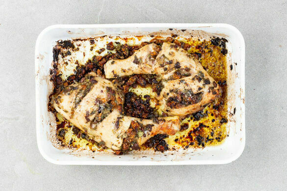 Einen stressigen Tag gehabt? Jetzt ist es an der Zeit, sich zurückzulehnen und die Hähnchenschenkel in aller Ruhe in einer köstlichen Sauce aus Oliven, Feigen, Kapern und Oregano im Ofen schmoren zu lassen. Denn was gibt es Besseres als mit seinen Lieben entspannt am Tisch zu sitzen und saftiges Hähnchen mit einem cremigen Gemüsepüree zu genießen, in dem so viel Geschmack und doch so wenig Aufwand steckt?