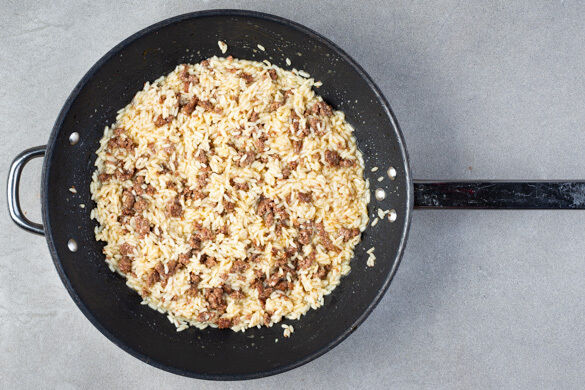 Die Hitze reduzieren, den Reis und den Knoblauch dazugeben und 1–2Min. anrösten, dann nach und nach mit der Brühe ablöschen und stetig rühren, damit der Reis nicht ansetzt. Diesen Vorgang 18–20Min. lang wiederholen, bis die Brühe aufgebraucht und der Reis bissfest ist. Evtl. etwas mehr Wasser zugeben.