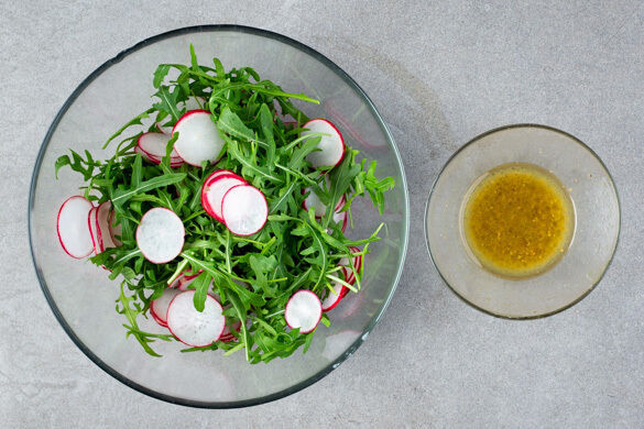 1EL Olivenöl, 2TL Essig sowie 1TL Senf zu einem Dressing verrühren und mit dem Rucola und den Radieschen vermengen. Die Pilze, das restliche Risotto und den Salat auf Teller verteilen und servieren.