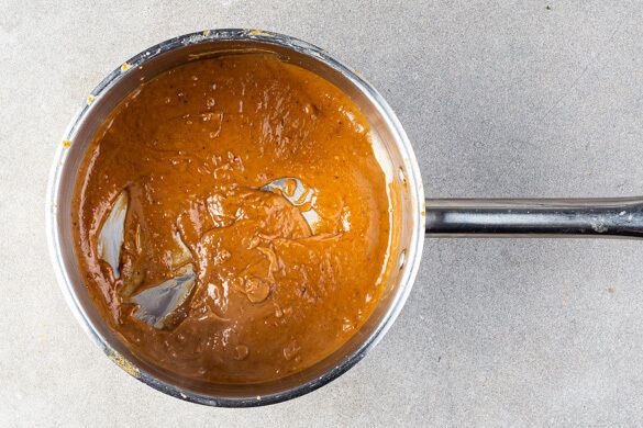 Die 1/2 der Chiliflocken und das restliche Currypulver in einem kleinen Topf mit 1EL Pflanzenöl bei mittlerer bis niedriger Hitze ca. 30Sek. anbraten. Die Erdnussbutter, die Worcestershiresauce, 80ml Wasser, 1EL hellen Essig und 1TL Honig hinzufügen und unter ständigem Rühren erwärmen, bis das Erdnussdressing eingedickt ist, dann vom Herd nehmen.