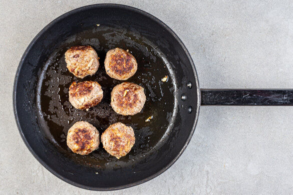 Die Zwiebel schälen und grob reiben, dann mit dem Hackfleisch, der Gewürzmischung, dem Panko-Paniermehl, 2EL Milch, 2TL Salz und 1TL Pfeffer verkneten. Zu ca. 12 gleich großen Bällchen formen. Die Hackbällchen in einer großen Pfanne mit 2EL Pflanzenöl bei mittlerer bis starker Hitze 5–6Min. rundum braun anbraten, aus der Pfanne nehmen und beiseitestellen.