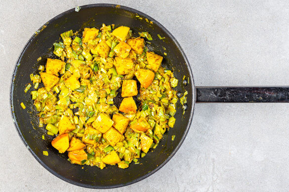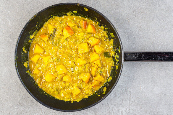 Die Äpfel vierteln, entkernen und grob würfeln. Den Lauch längs halbieren und in feine Streifen schneiden. 4EL Butter in derselben Pfanne schmelzen lassen, die Äpfel und den Lauch dazugeben und bei mittlerer Hitze 5–6Min. weich braten. 2EL Currypaste sowie 2EL Essig einrühren und 1–2Min. köcheln lassen. Ggf. mit mehr Currypaste abschmecken.